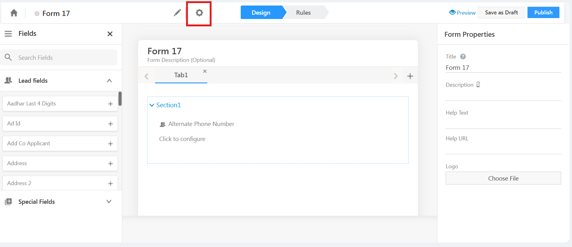 While creating the form, navigate to the gear (settings) icon.