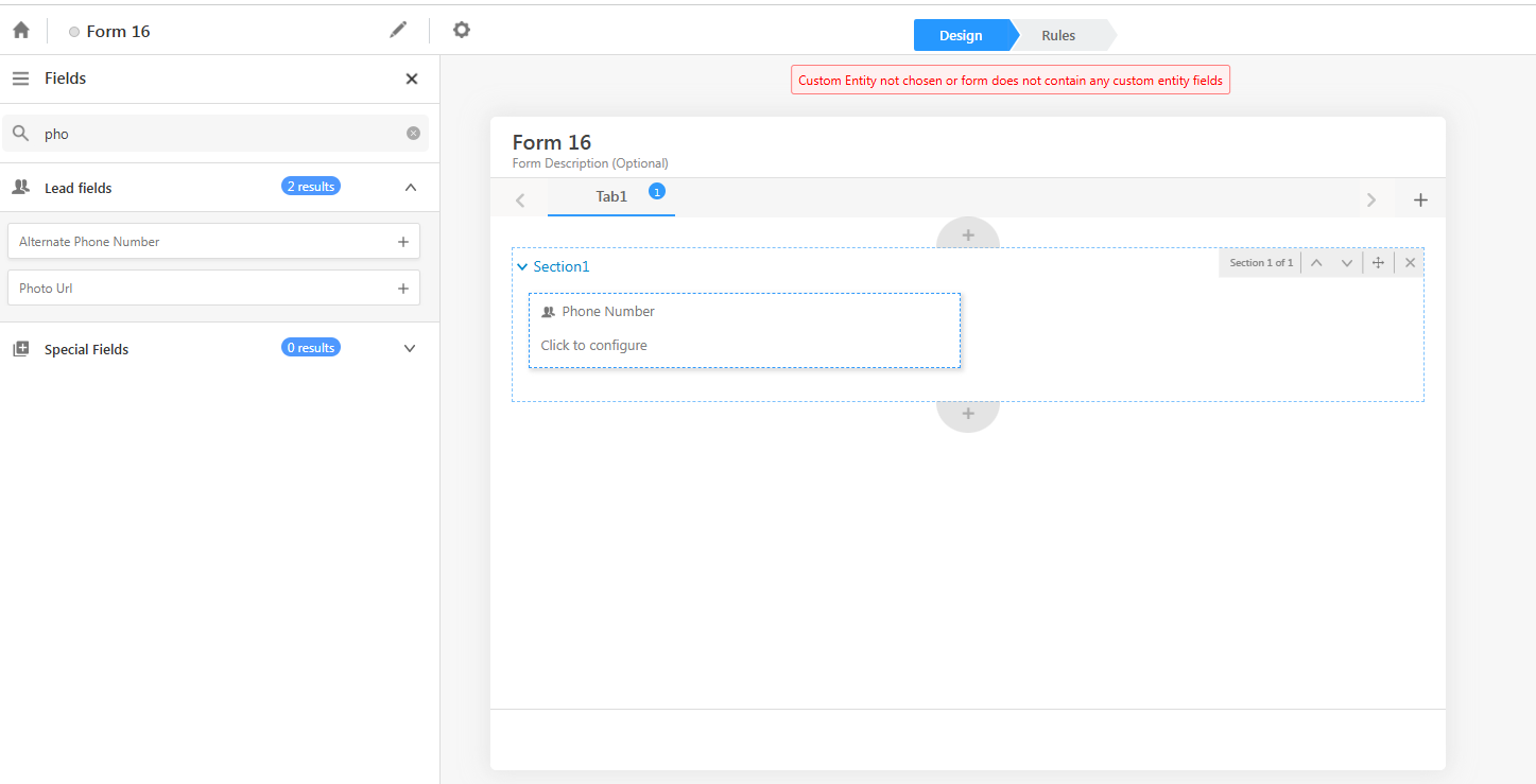 “Custom entity not chosen or form does not contain any custom entity fields.”