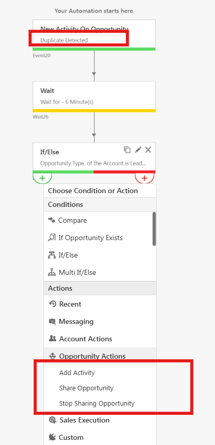 Use case- We are trying to add Update opportunity card in New Activity on Opportunity Trigger type Automation (Activity- Duplicate Detected), but the Update Opportunity card is not visible.