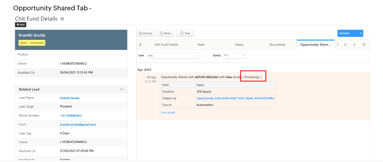 In certain cases, opportunities are correctly shared with users through the defined workflow. However, when the user attempts to access the opportunity, the system displays an “Access Denied” error, stating that the opportunity is not shared. Upon verification from the Admin side, the opportunity appears to be in a “Processing” phase for the user, yet the access is not fully granted and the process does not complete. This inconsistency between workflow-based sharing, admin visibility, and actual user access is causing access failures and delays in opportunity processing.