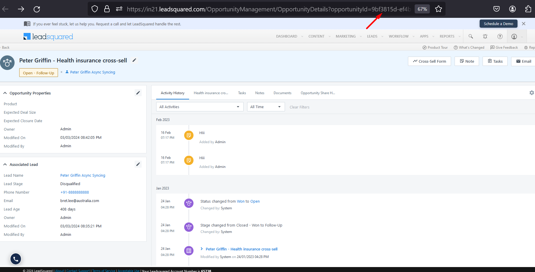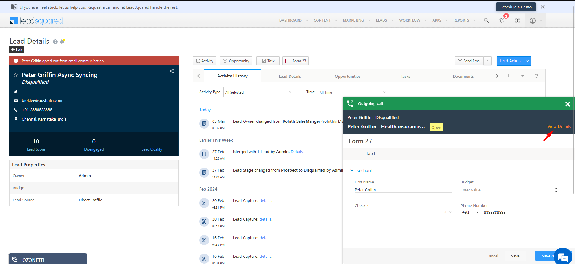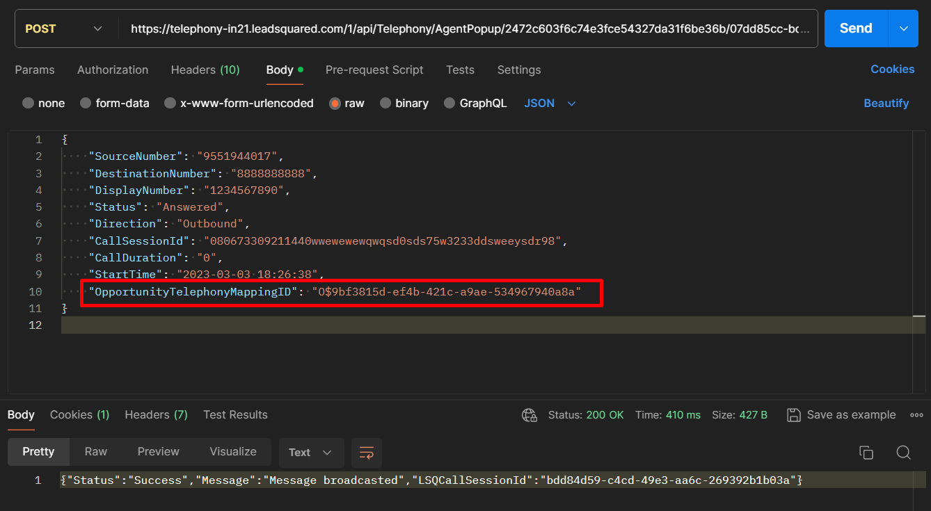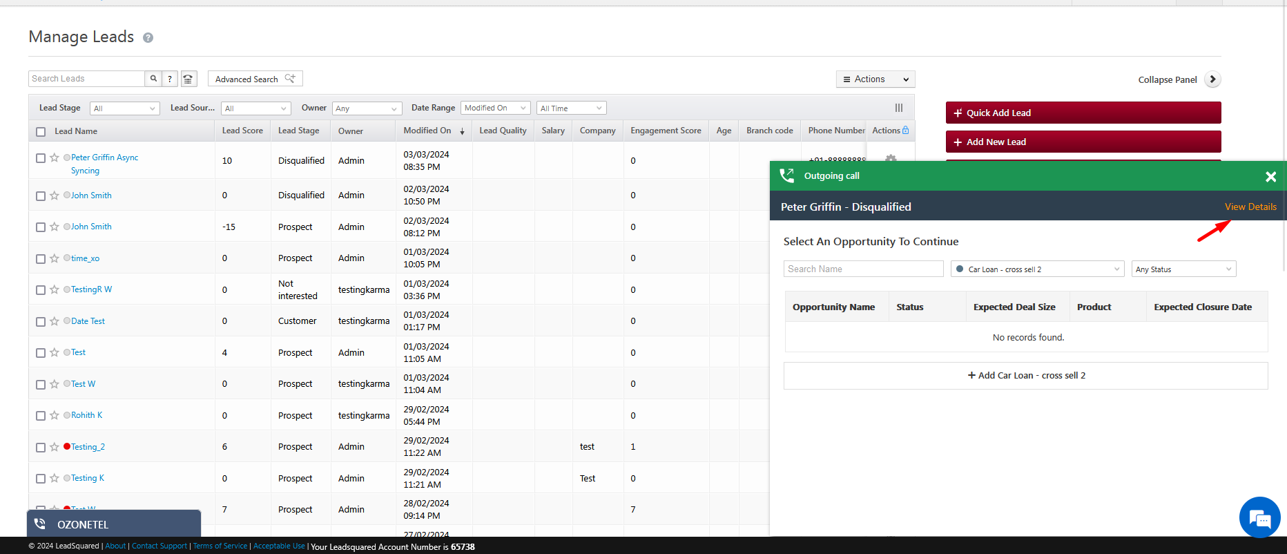 By default the View Details Button will have the Lead Link in it fetched by the Get APIs used in the Telephony Connector if the View Details Button should route to the Opportunity Details page then we have to pass another parameter “OpportunityTelephonyMappingId”:”O${{OpportunityId}}” in the Agent POP-UP API.