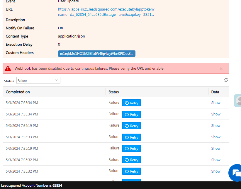 You might encounter an issue where a webhook gets automatically disabled post repeated failures. When you check the webhook, the message would say “Webhook has been disabled due to continuous failures. Please verify the URL and enable.”