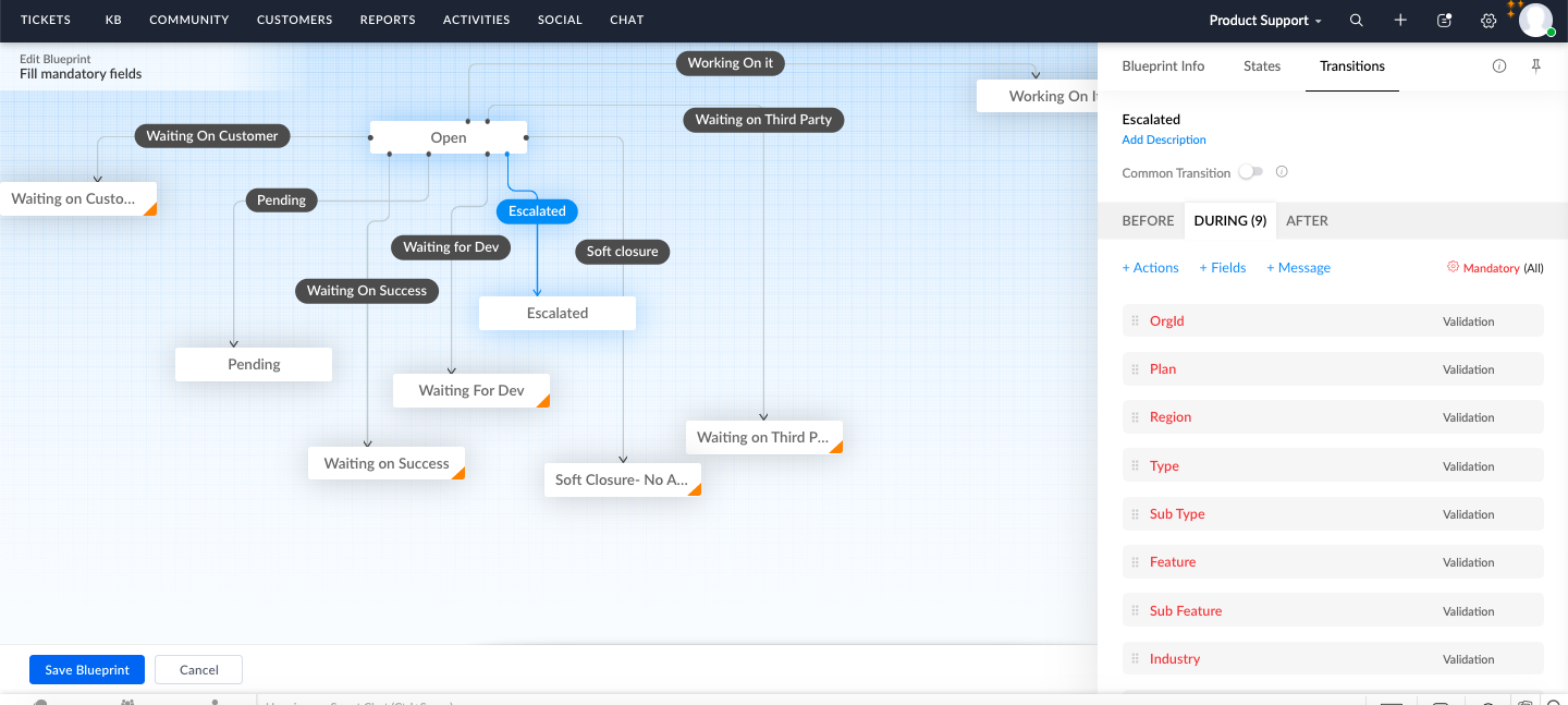 We have a limitation in Desk where in even though the fields are set as mandatory, still you could save the status without entering the value. To overcome this error/ miss, we brought in Blueprint function which will ensure the agent is entering the mandatory fields before changing the status initially.